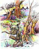 Only a few Goblin's reach this higher level of spirituality. Clinging, trance like, to a branch and using his tail for balance, the reflecting Goblin can loose all track of time, shut down his non essential organs and stay like this for months at a time. Moss has been know to grow on them they sit so still. They are particularly dangerous when they come out of the trance mainly because the are just really really hungry.